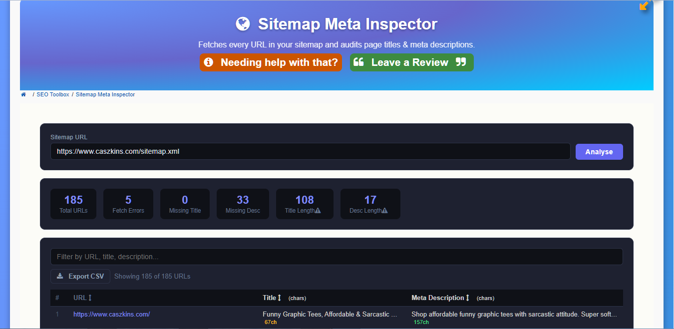 Enter the url of your sitemap to see which of your pages need tweaking, so far as page title and Meta descriptions.